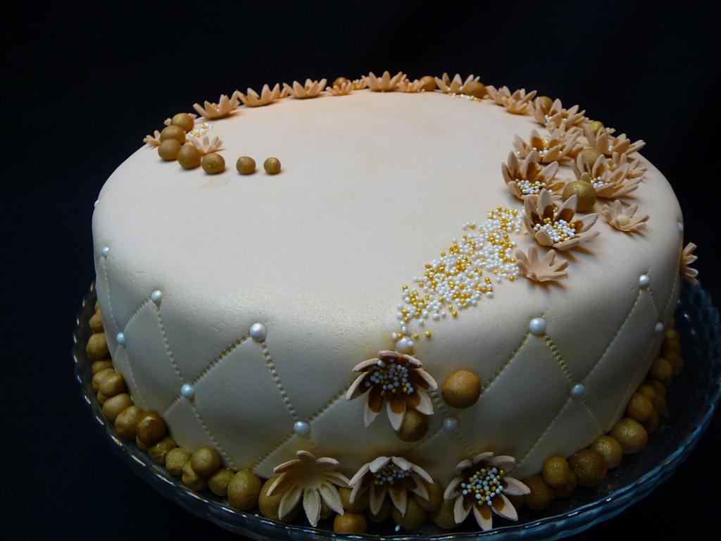 Este un tort pregatit pentru o bunica care implineste frumoasa varsta de 80 ani. Nepotii vroiau un tort elegant, nu prea colorat, s-au inspirat de pe blogul Homoktorta si s-au hotarat la aceasta combinatie de bej, maro. Si eu ador aceasta combinatie de culori, totodata m-am gandit de ce sa nu-l facem un pic mai "sarbatoresc" si am aplicat pe aici pe colo pudra aurie. Imi place foarte mult cum a iesit sper sa placa si sarbatoritei. Blat de amandina insiropat din belsug cu sirop de caise, umplut cu frisca, iaurt, multa zeama de lamaie si fructe de padure. L-am acoperit cu fondant din marshmallow amestecat cu fondant din ciocolata si l-am decorat cu floricele din pasta de zahar. 3kg.